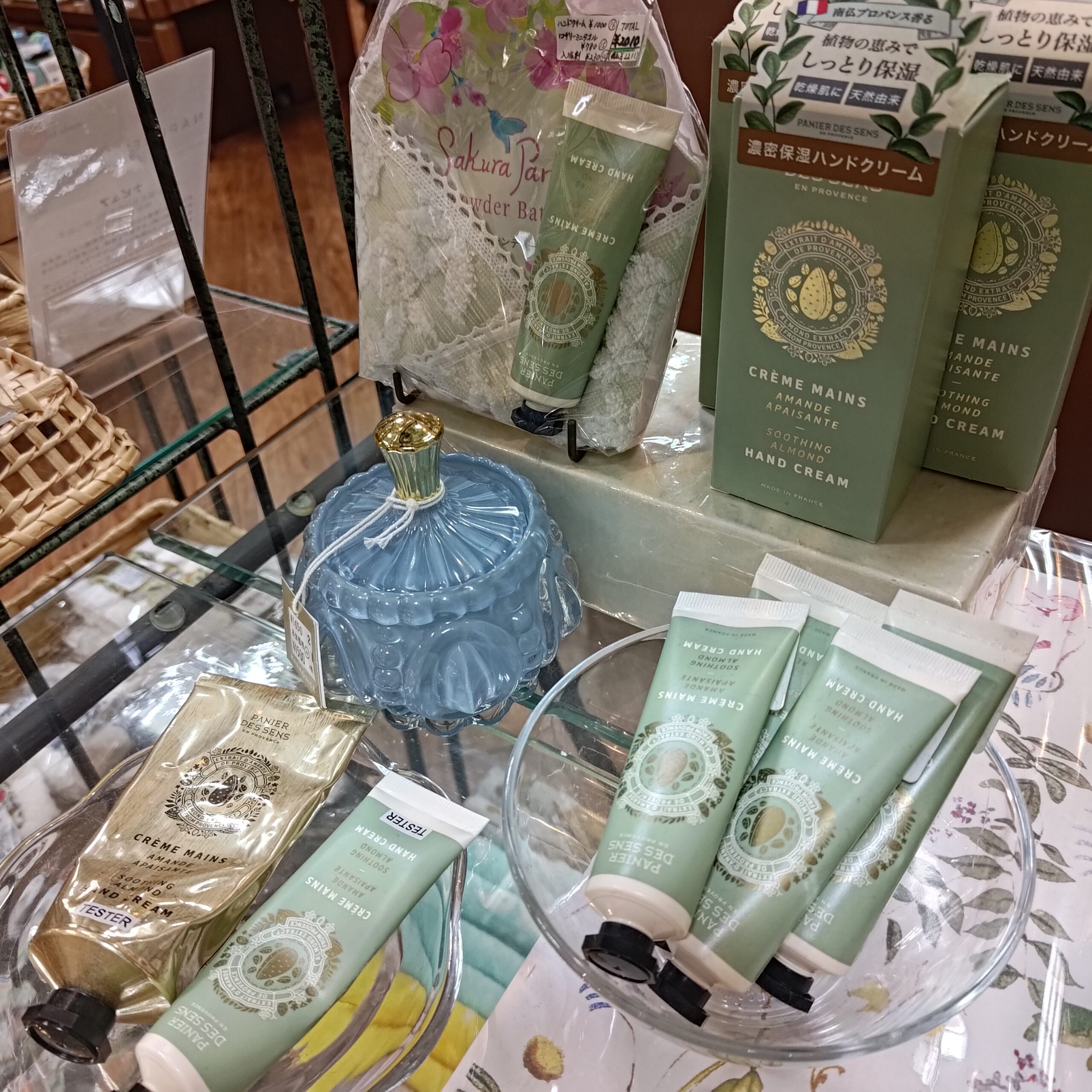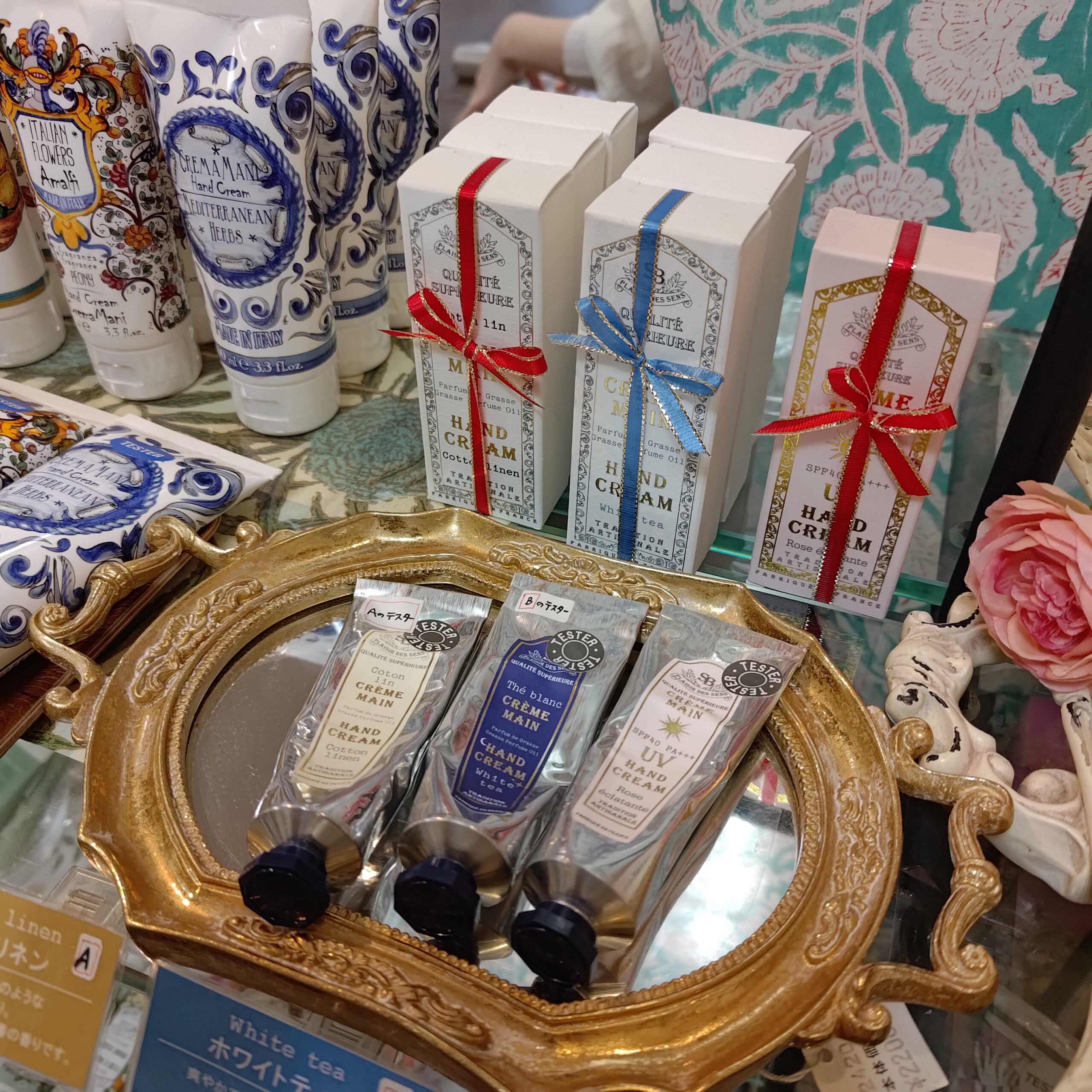 たくさんのハンドクリームをお揃えしております。ぬり心地や香りをお試しいただけるようにテスターもご用意しております。
